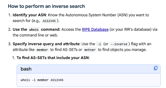 I forgot how to do an inverse search to find my ASN in as-sets. So Google AI tells me: Yet: hank@nocvm:~$ whois -h whois.ripe.net -i members as378 % This is the RIPE Database query service. % The objects are in RPSL format. % % The RIPE Database is subject to Terms and Conditions. % See https://docs.db.ripe.net/terms-conditions.html % Note: this output has been filtered. % To receive output for a database update, use the "-B" flag. %ERROR:105: attribute is not searchable % % "members" is not an inverse searchable attribute. %ERROR:101: no entries found % % No entries found in source RIPE. % This query was served by the RIPE Database Query Service version 1.120 (DEXTER) What am I doing wrong? Thanks, Hank